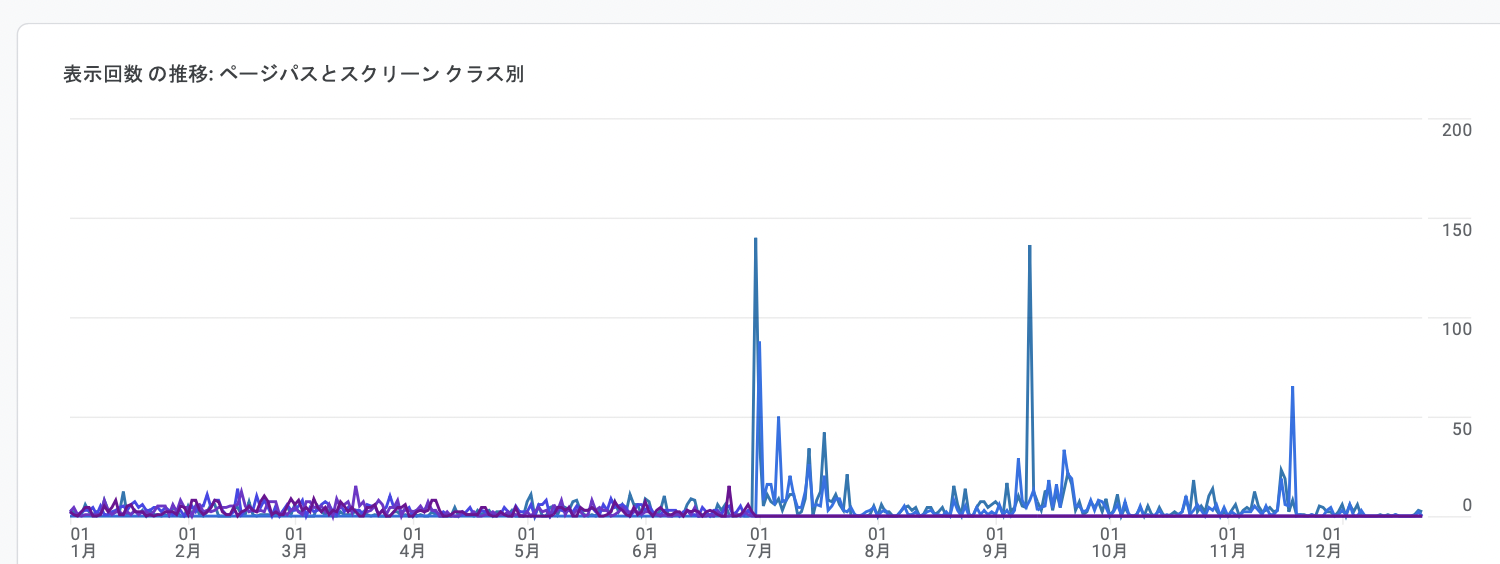 PVとしては、月600PVで(年間8188)くらいでした。今年は2記事しか書いていないので、過去の資産で読まれた記事が多かったんだと思います。(GA4対応を夏にやり、UA時代のPVも勝手に繋げてくれて便利ですね)